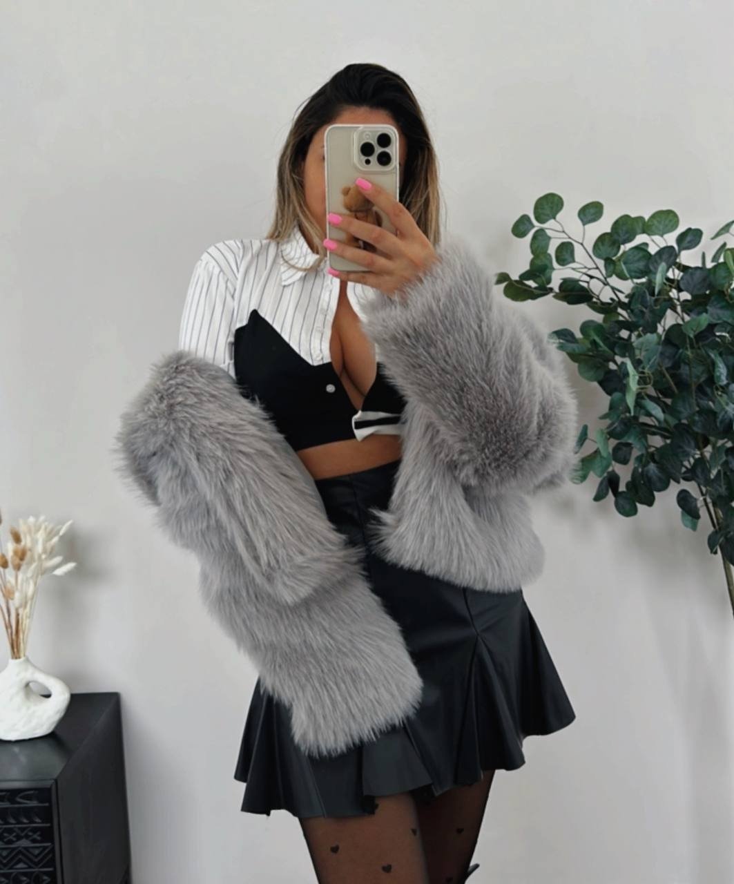 Un mix stylish între clasic și îndrăzneț – această cămașă scurtă cu dungi subțiri și top negru cusut oferă un look smart, sexy și urban. Decolteul adânc și croiala cropped pun în valoare silueta, fiind alegerea perfectă pentru apariții moderne și pline de atitudine.