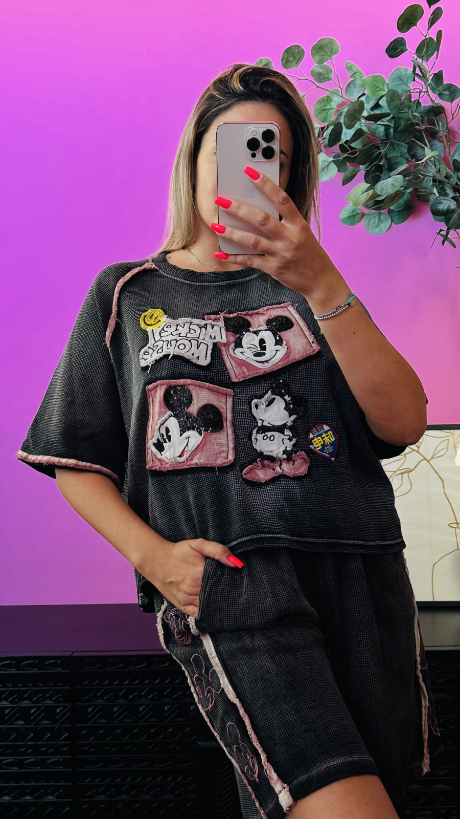Îți dorești o ținută care combină confortul total cu vibe-ul street nostalgic? Compleul „Retro Mickey Mood” aduce exact asta: un set format din tricou cu croială largă și pantaloni scurți din material texturat, decorat cu aplicații în stil colaj inspirate din universul desenelor animate. Fiecare detaliu roz, cusături vizibile și margini neterminate adaugă un efect handmade super autentic.