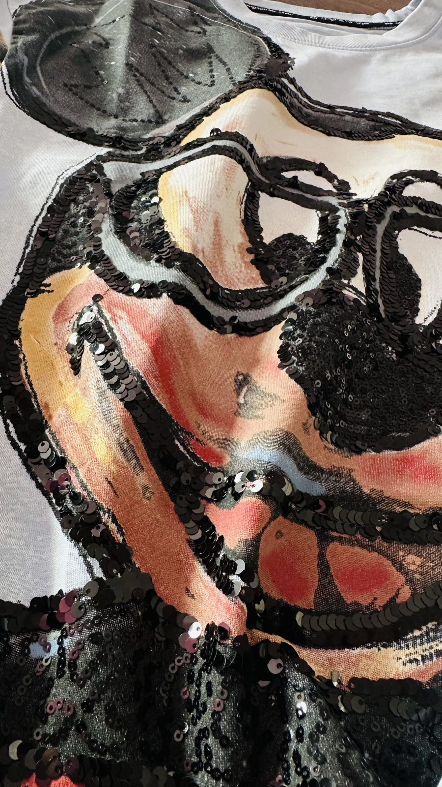 Detalii speciale: paiete aplicate pe tricou, tăieturi decorative la mâneci și pantaloni.