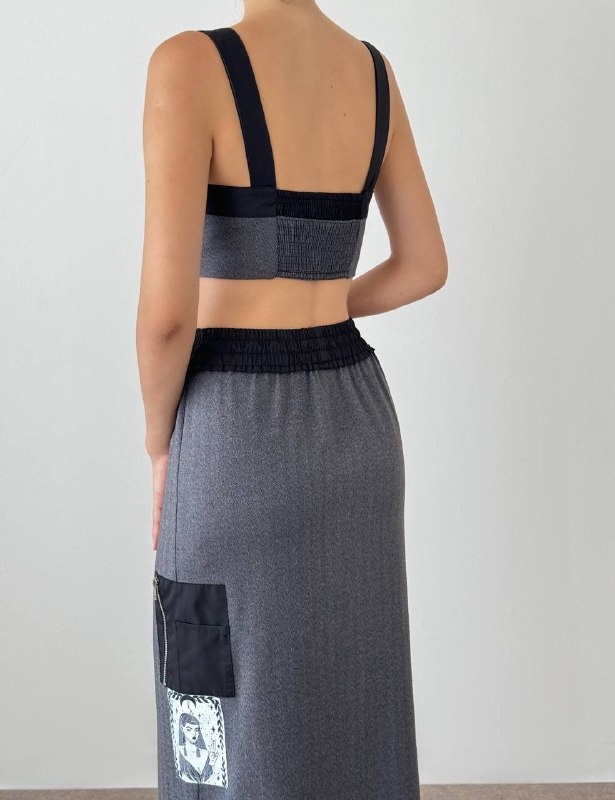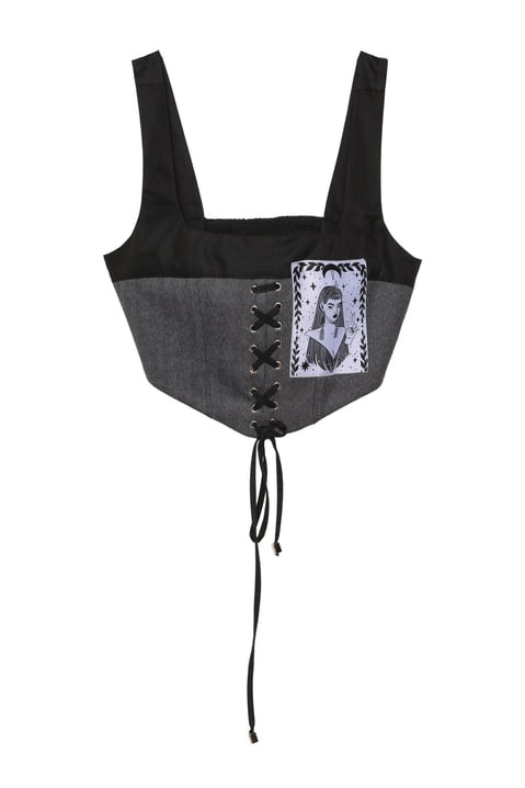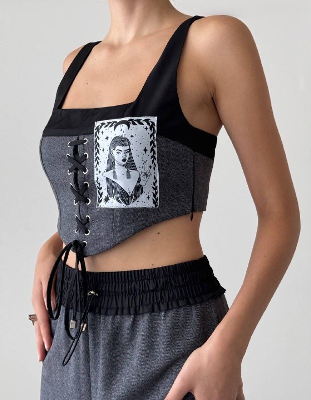 Top stil corset cu șiret reglabil în față, combinație din material textil gri și negru pentru un efect contrastant modern. Accesorizat cu un patch grafic imprimat ce oferă un vibe artistic și rebel. Ideal pentru ținute urban chic sau festivaluri. Se potrivește perfect cu blugi, pantaloni cargo sau fuste cu talie înaltă.