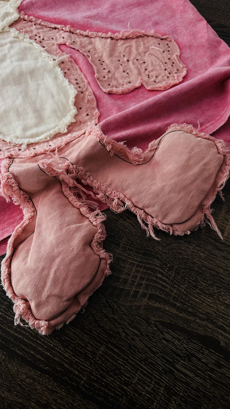 • Aplicație: mare, pe spate – pantera roz din bucăți de material brodat, cu texturi și contur franjurat.