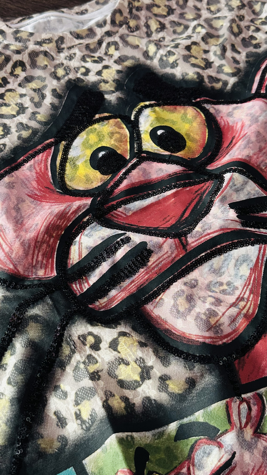 Design: Print pop-art cu Pantera Roz, oversized și paiete aplicate