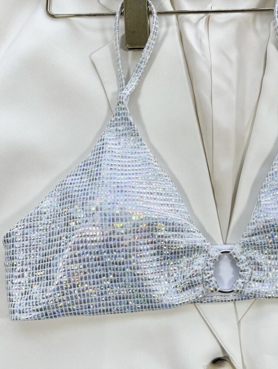 Strălucește pe plajă cu un costum de baie spectaculos! Modelul în 2 piese are o croială sexy și detalii metalice argintii care accentuează silueta.
