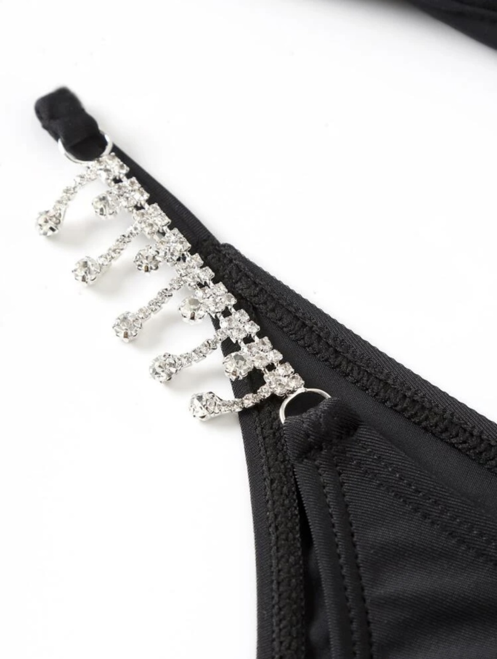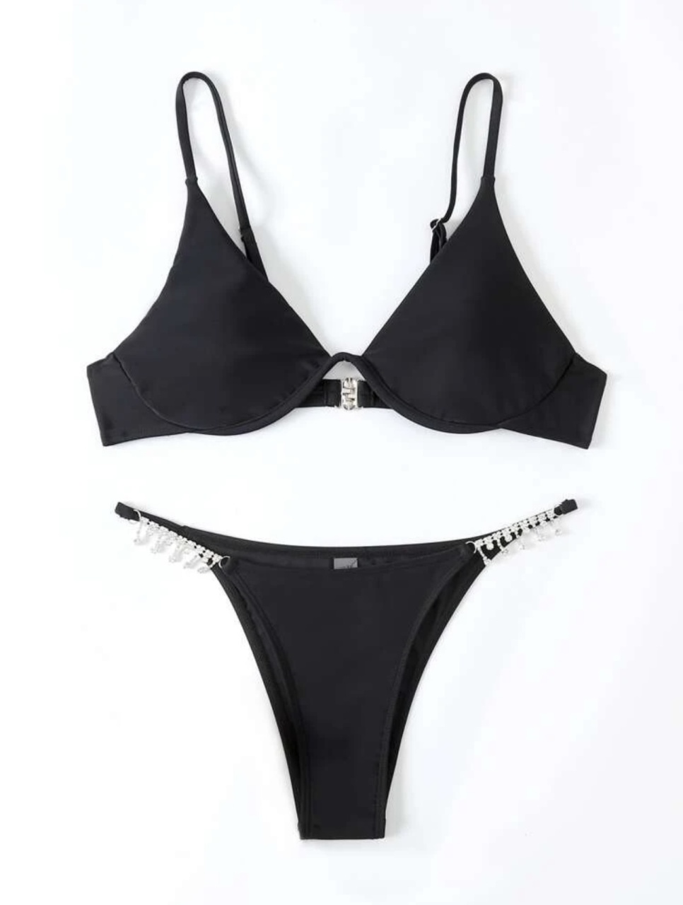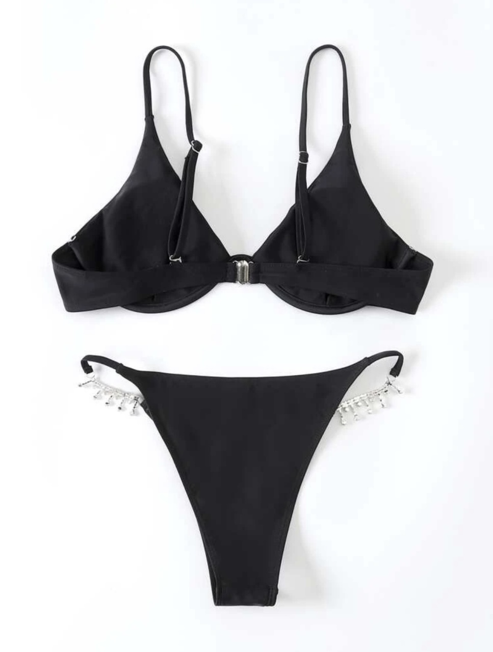 Alege un look rafinat și seducător pentru plajă cu acest costum de baie negru din 2 piese, accesorizat cu pietricele elegante pe șolduri. Sutienul triunghiular cu armătură oferă susținere ușoară și un decolteu natural, în timp ce slipul decupat îți pune în evidență silueta. Ideal pentru femeile care iubesc minimalismul cu accente glam.