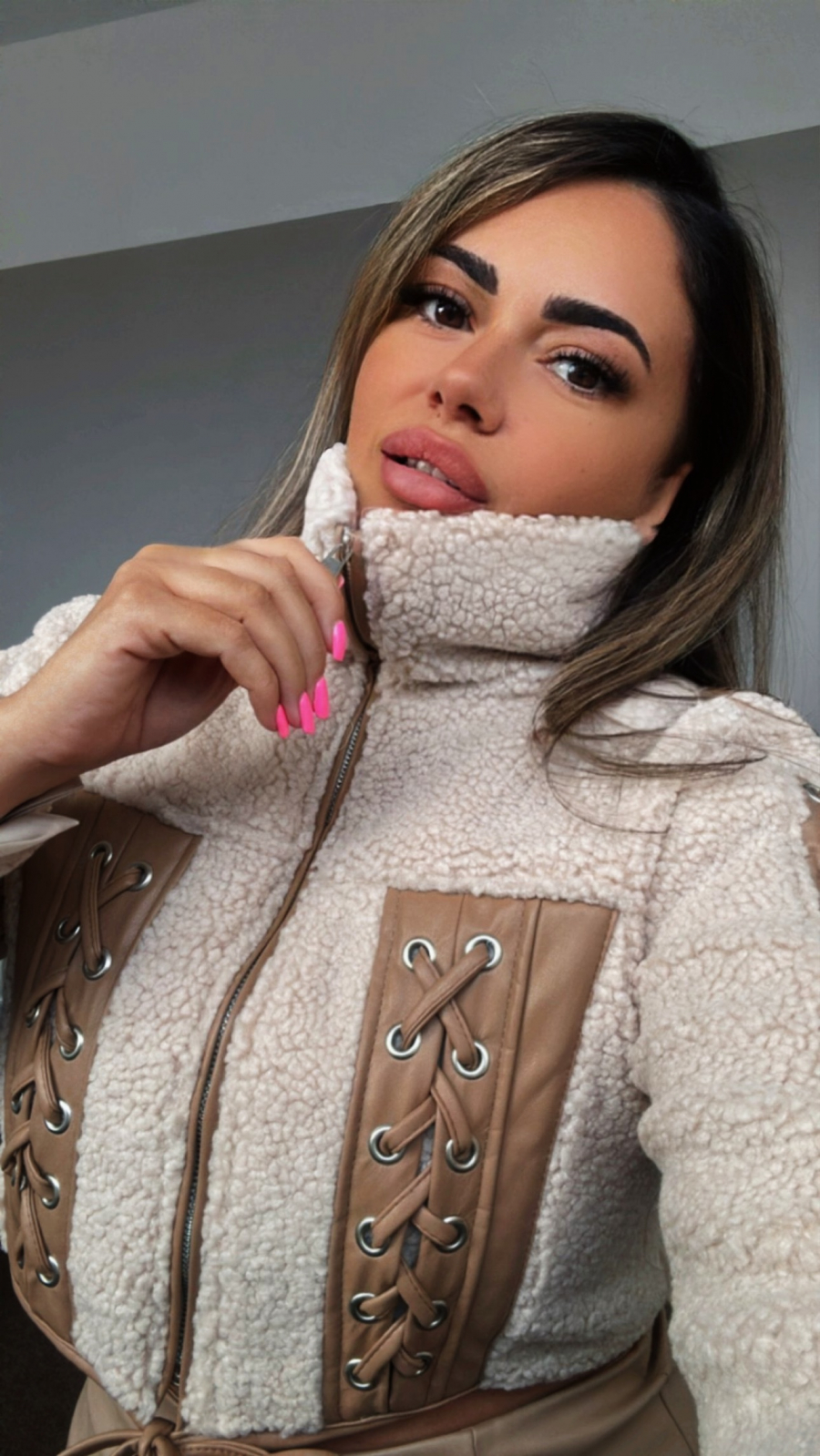 Adaugă o notă de rafinament garderobei tale de iarnă cu acest cojocel scurt bej, îmbogățit cu detalii sofisticate din piele ecologică maro. Designul său modern, cu inserții tip corset și șnur decorativ, este ideal pentru apariții elegante, dar cool. Interiorul moale și călduros îl face perfect pentru sezonul rece, oferindu-ți tot confortul de care ai nevoie fără a compromite stilul.