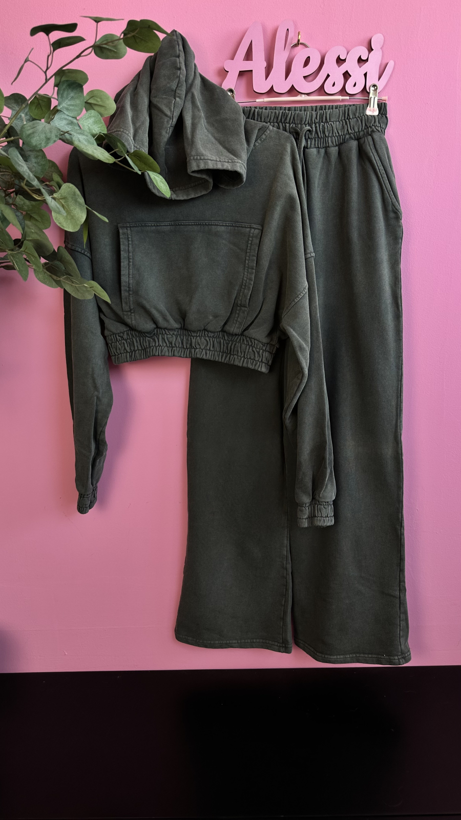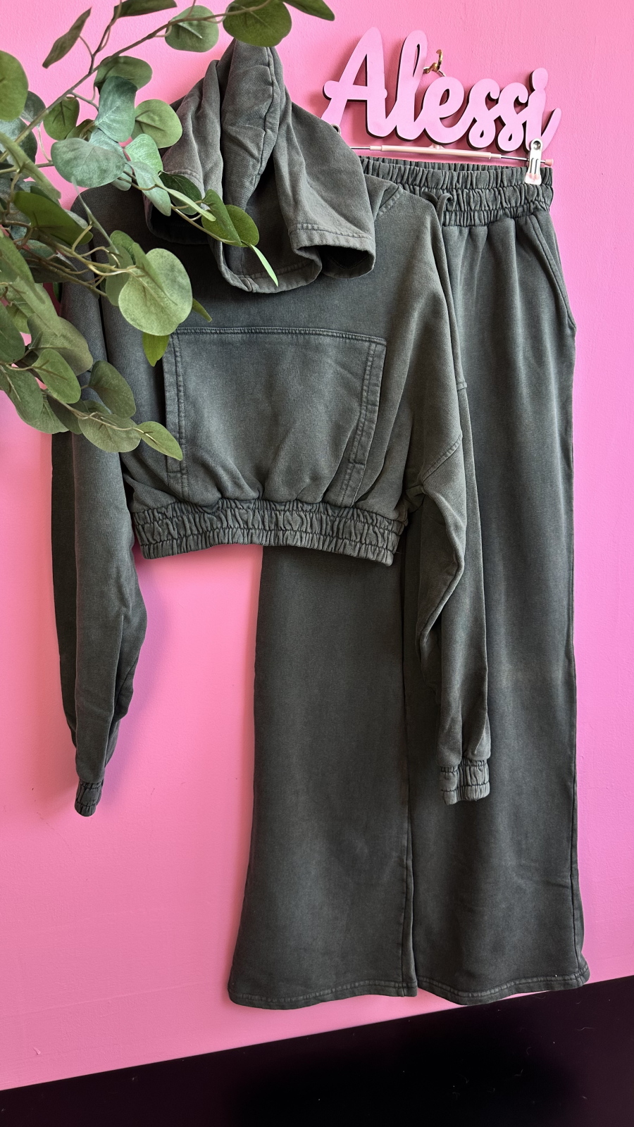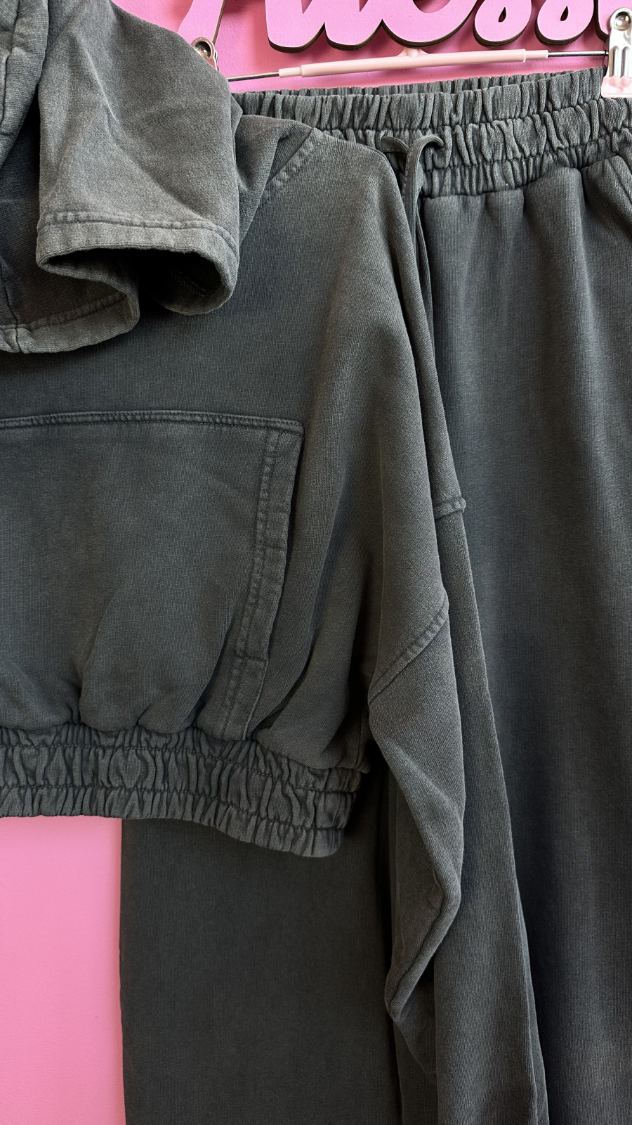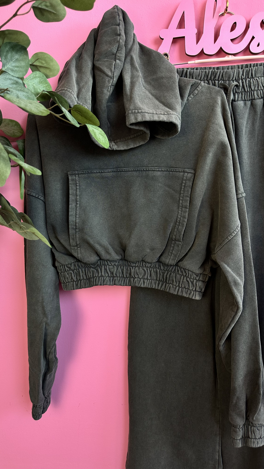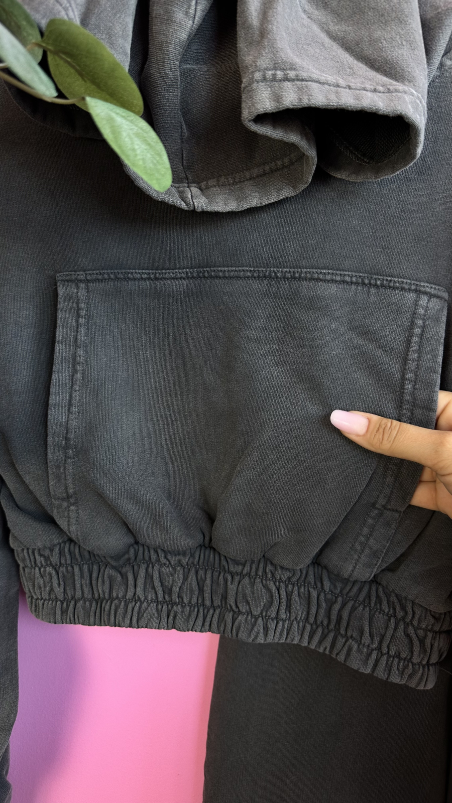 • Set 2 piese: bluză cropped cu glugă + pantaloni